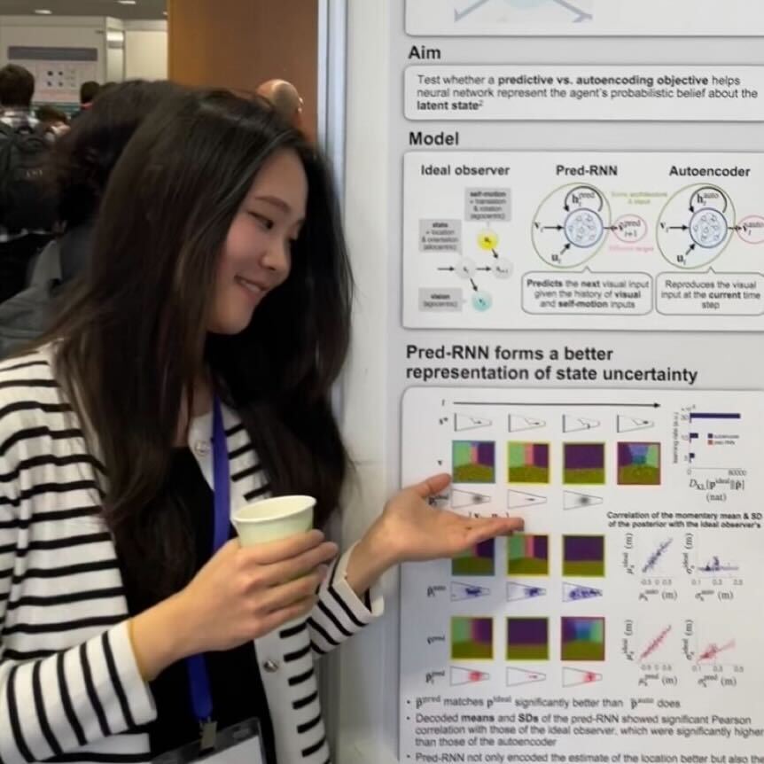 Yeowon is a graduate student in the Department of Bio & Brain Engineering at KAIST. Before joining the lab, she studied biomedical engineering at Sungkyunkwan university. She is interested in understanding the neural processes involved in spatial navigation, employing AI models as tools. Her current project aims to examine how predictive objective can help in learning probabilistic representations in the brain. Outside the lab, she enjoys walking and traveling.